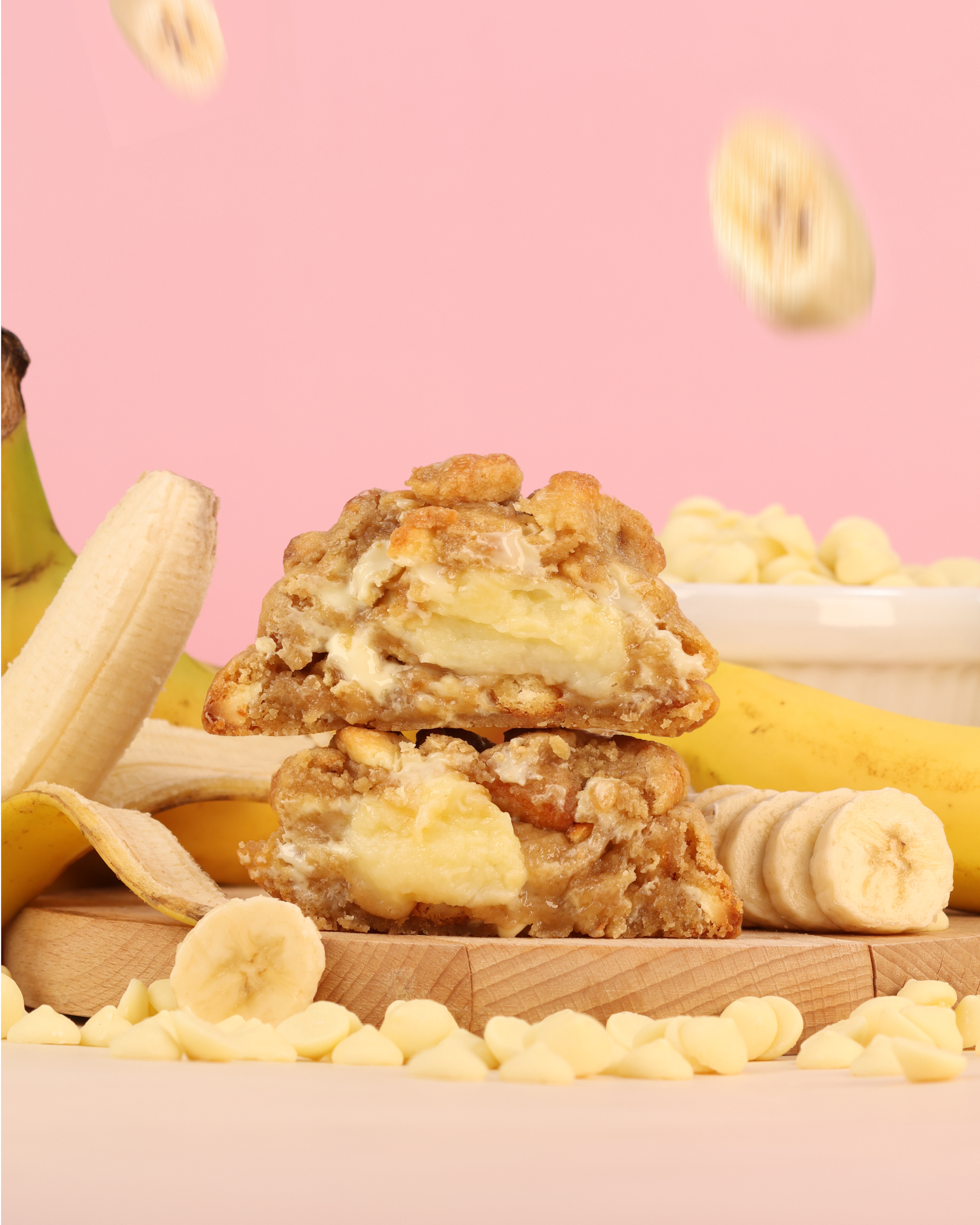 Gjord med ekologiska bananer, fylld med ett krämigt vaniljkräm i mitten, krispiga vanilla wafer och täckt med belgisk vit choklad.