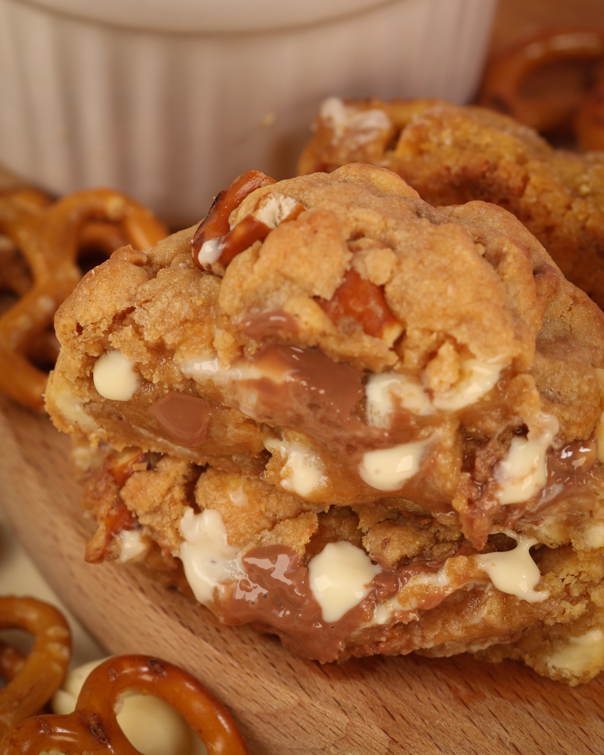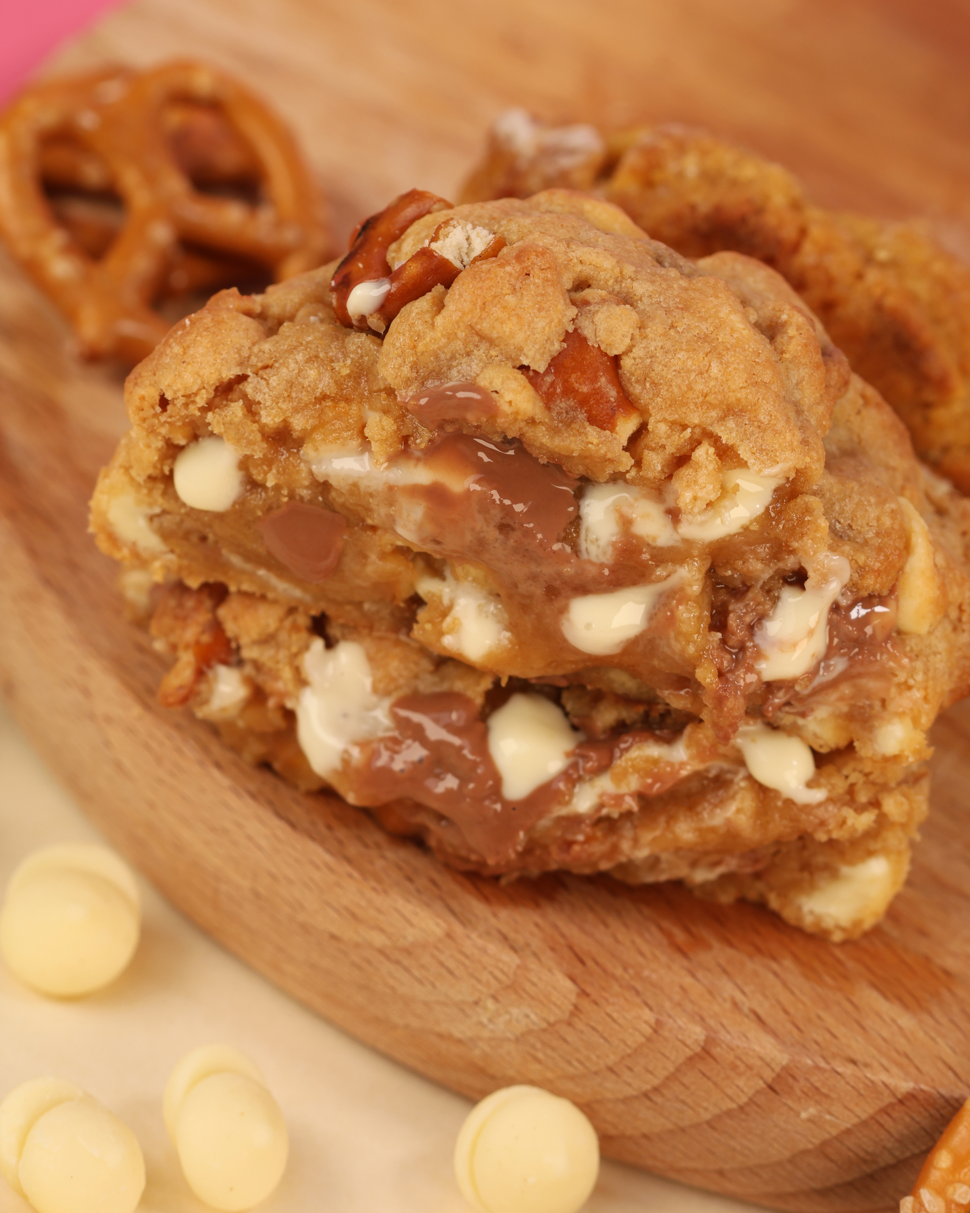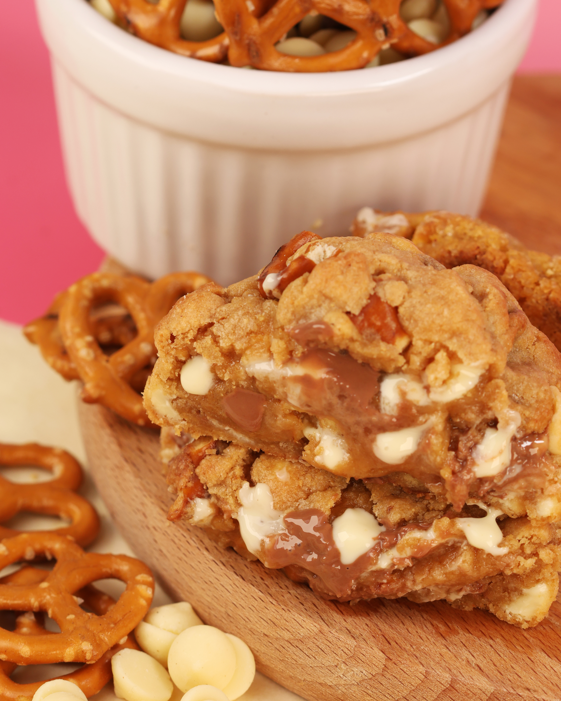 Gjord med pretzel, vita- och mjölk chokladbitar, berikad med rostad mjölkpulver.