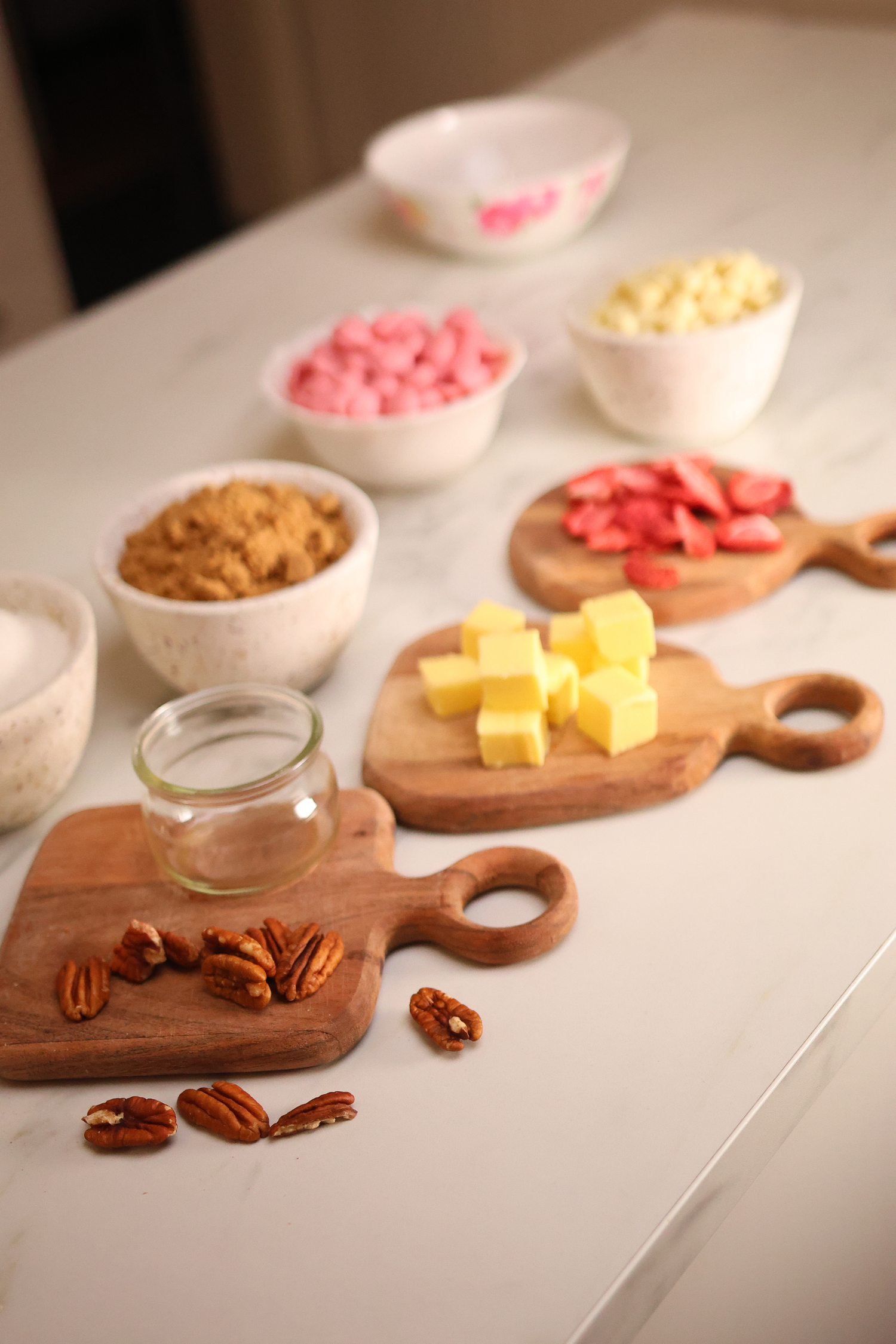 Vetemjöl, vita chokladbitar, socker, farinsocker, smör, ägg, kakaopulver, bakpulver, vanilj och salt.